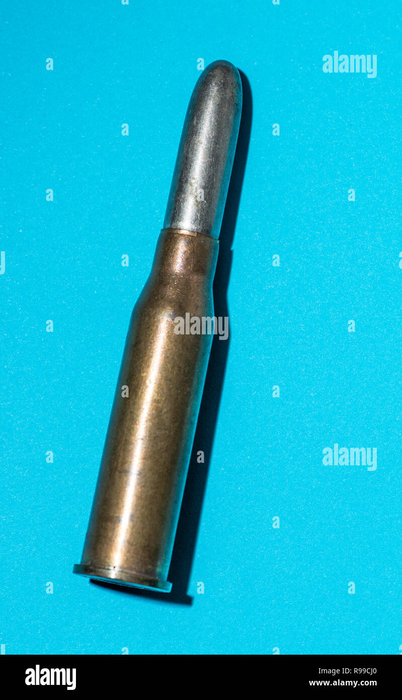 One Weapon Ammunition Cartridge On Clean Background Single Isolated Bullet On Blue Background Stock Photo Alamy